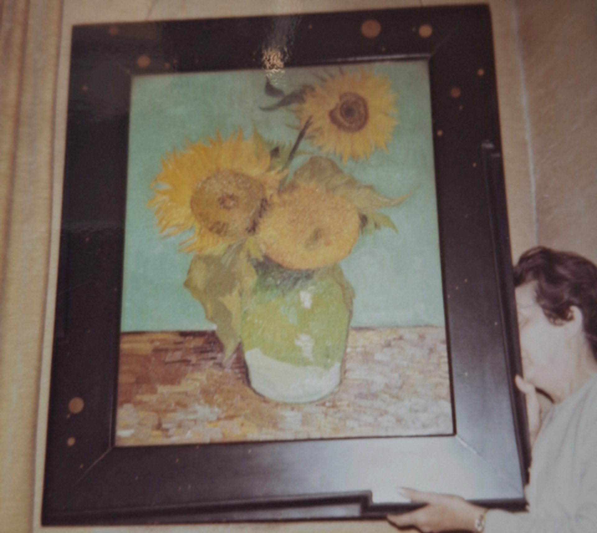 Paulette Angladon-Dubrujeaud with the framed Three Sunflowers in the residence of her father-in-law Jean Dubrujeaud in Paris (1967)