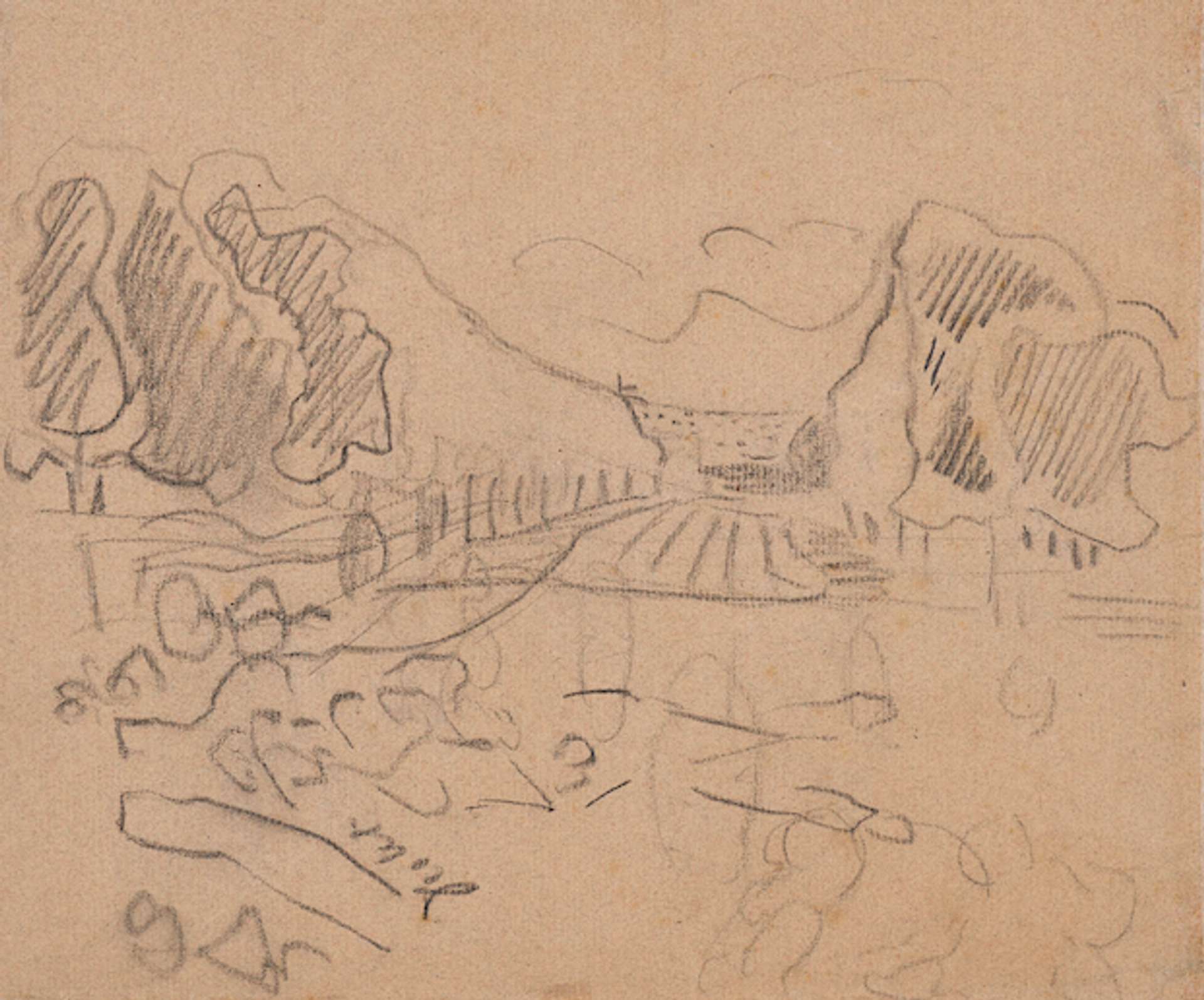 On the reverse of Pickers of Peas is a landscape sketch, depicting two rows of trees on either side of a field. Hills and a cloud are in the background.
