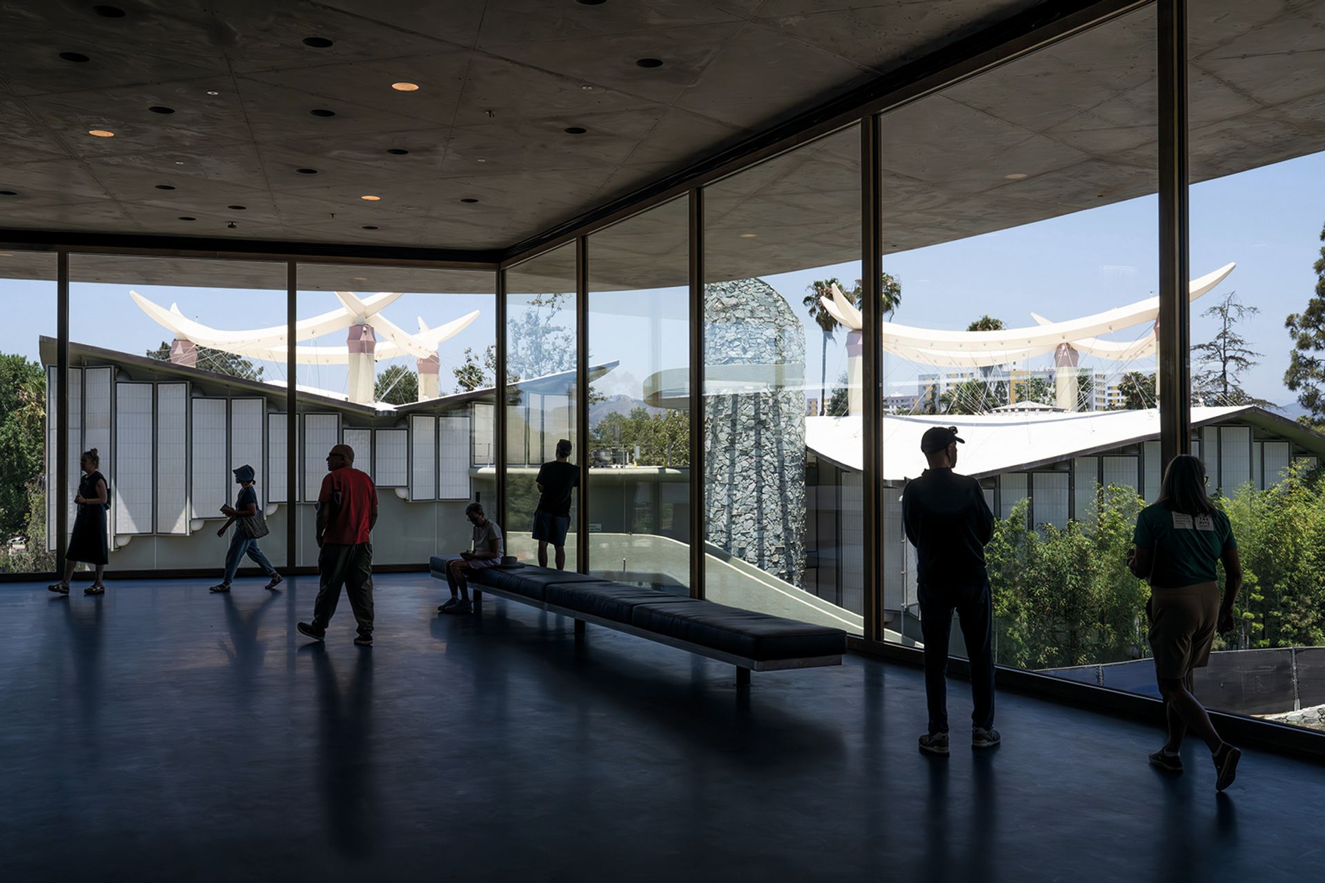 That is borne out in the new building, an enormous, undulating concrete expanse that adds 110,000 sq. ft of gallery space to the museum, as well as 3.5 acres of public park space. It curves dramatically to arc over Wilshire Boulevard and bend towards and away from other parts of the campus. The galleries are concrete, with a large overhang that juts past the floor-to-ceiling glass windows. Works will hang directly onto the concrete walls. “Concrete is a millennia old,” Govan says. “Old art doesn’t look good on [plasterboard].”