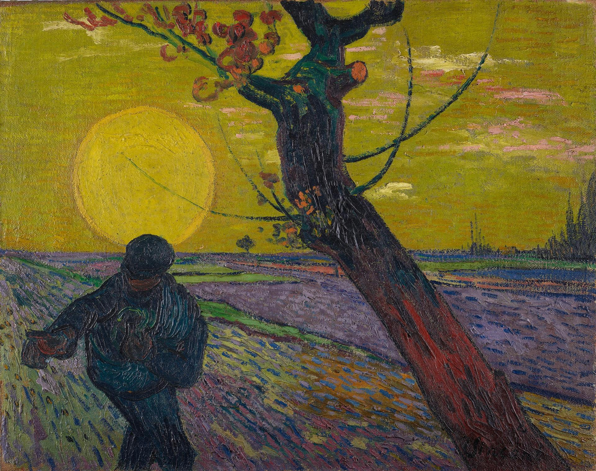 The Sower at Sunset (November 1888) is one of the two Van Gogh masterpieces in the Bührle Collection. Painted in Arles, the figure of the sower is based on a Jean-François Millet print greatly admired by Van Gogh. The enormous sun is almost a halo over the peasant. The cropped tree is a motif adopted from Japanese prints, another source of admiration for Van Gogh.