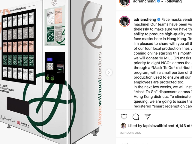 Billionaire art collector Adrian Cheng to distribute free face masks in vending machines throughout Hong Kong
