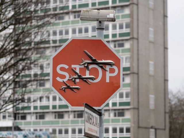 New mural appeared in south London of three military drones stuck to a red “stop” sign—but has already been removed by two unknown men