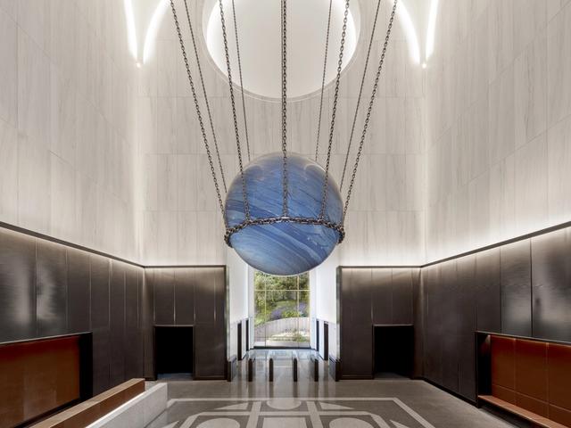 A 22,000 kilogram spherical stone now dangles over the lobby of a skyscraper on 550 Madison