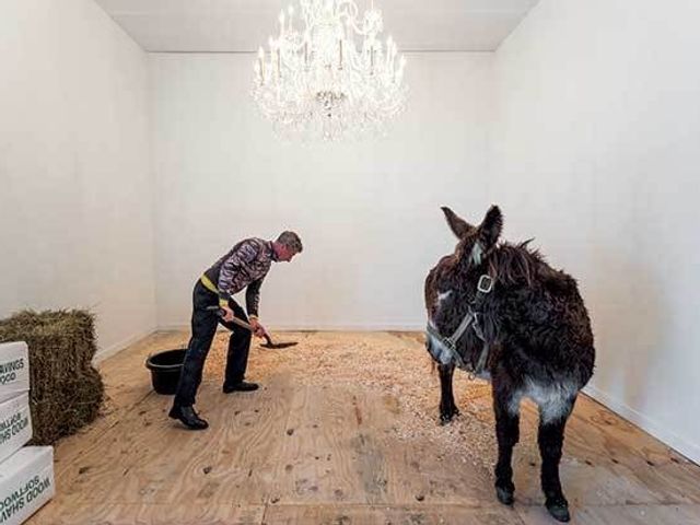 Maurizio Cattelan and a donkey who's starred at the Met—it must be Frieze New York