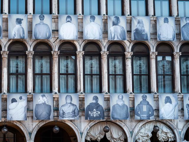 The public works, inspired by the French street artist JR, have been installed on the facade of the 16th-century Procuratie Vecchie