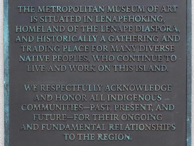 The Metropolitan Museum installs a plaque on its façade honouring the Lenape people, driven out of their New York City land