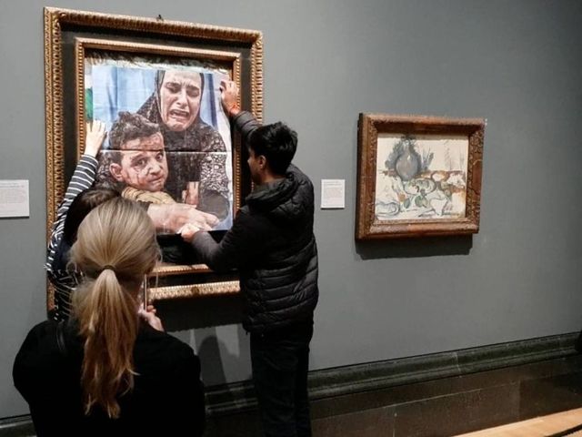 Members of campaign group Youth Demand covered the painting with an image of a Gazan mother and children
