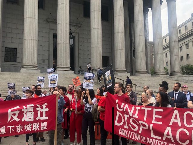 The coalition Art Against Displacement rallies against the construction of four contested luxury towers in a Manhattan Supreme Court hearing today