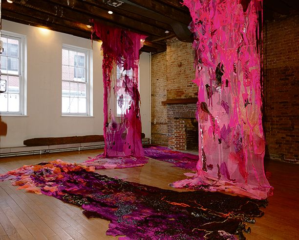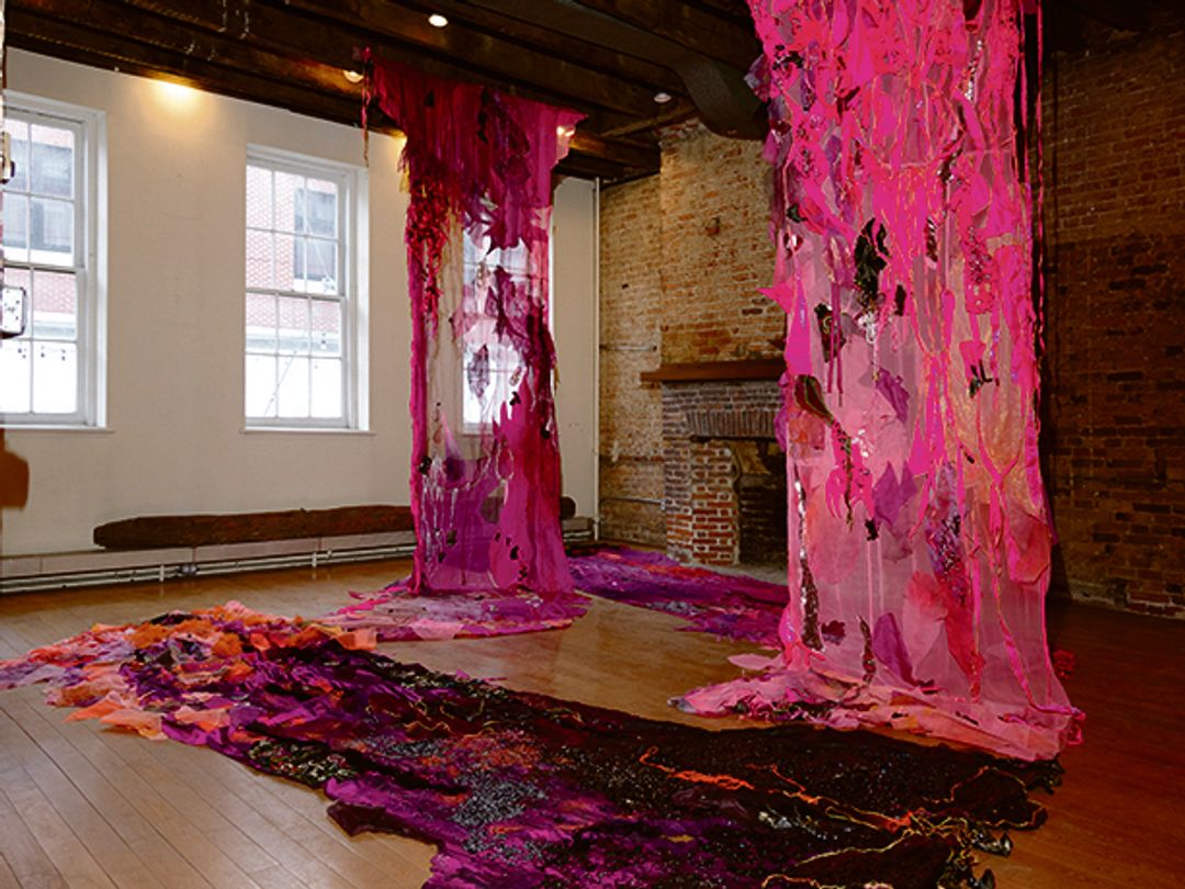 The exhibition, staged in the historic South Street Seaport district, brings textile works to an 18th-century warehouse