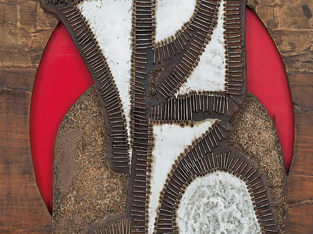 Abstract paintings and totem-like piece are among the early sales at the fair
