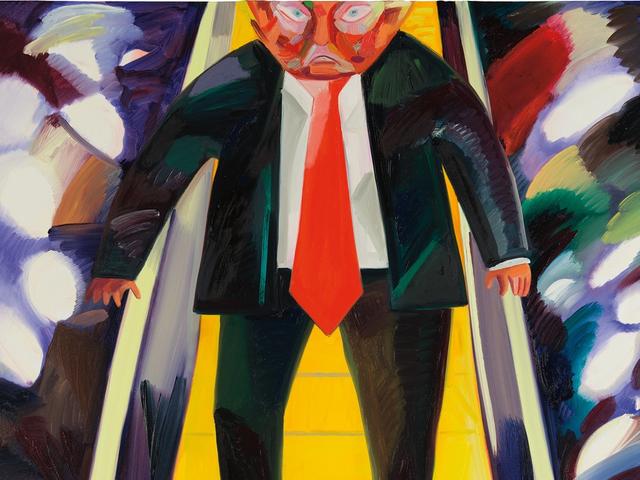 While the top lot of the night—a fiery self-portrait by George Baselitz—struggled to meet its low estimate, a bidding war broke out over Dana Schutz's painting of a bright orange Trump
