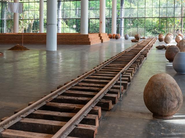 The installation features a reclaimed Ghanaian railroad track that visitors were previously encouraged to interact with