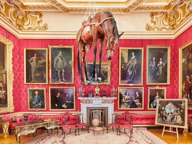 Known for this dangling horse and gold toilet, the Italian artist's exhibition is in the unlikely setting of Winston Churchill's birthplace