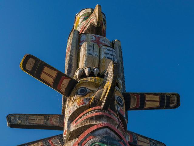 Stanley C. Hunt’s memorial monument features carvings of 130 faces, representing Indigenous children whose remains were found in unmarked graves near a school site