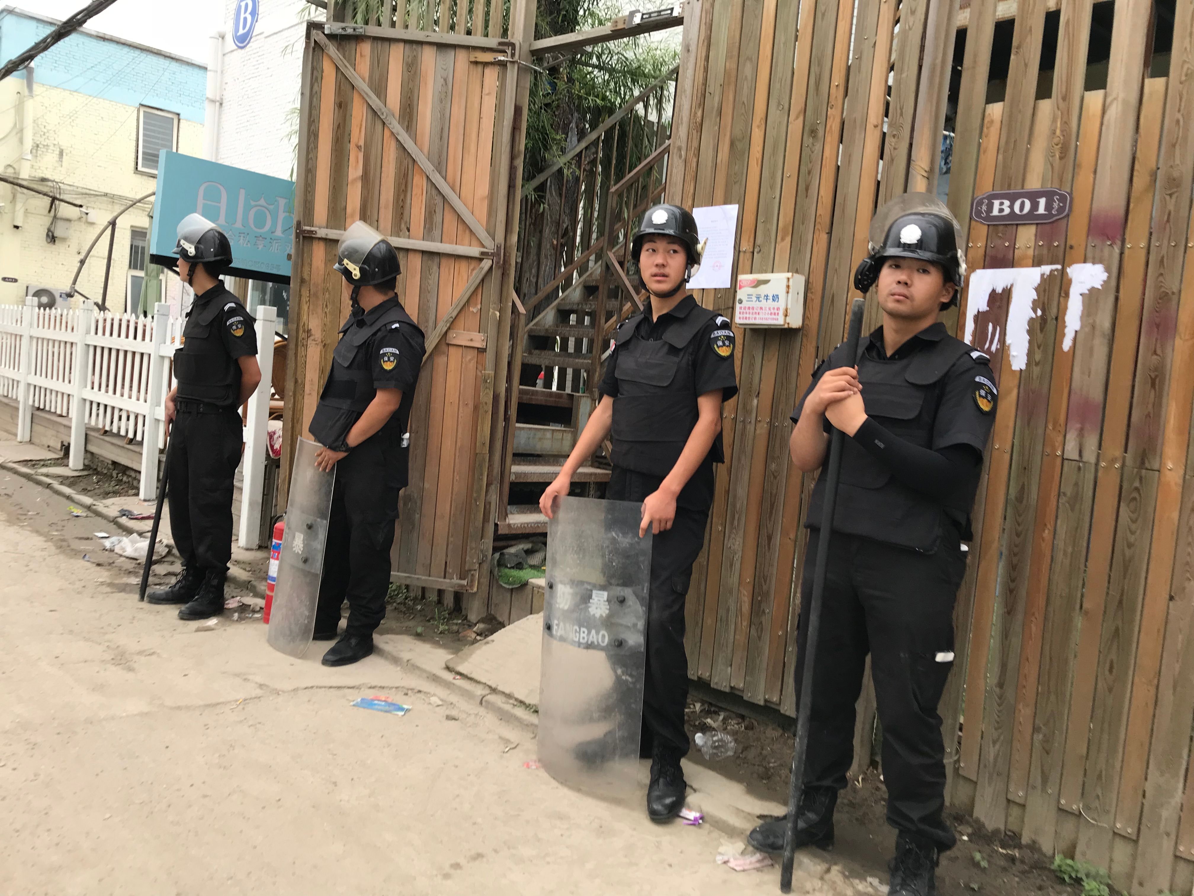 Police in riot gear escort hundreds of artists working in area studios from the premises
