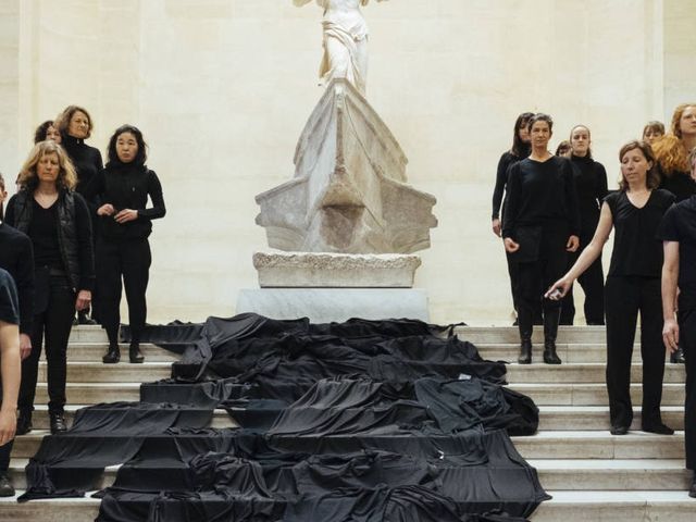 In the first climate change performance inside the Paris museum, protesters shed black clothes to create a mock oil spill