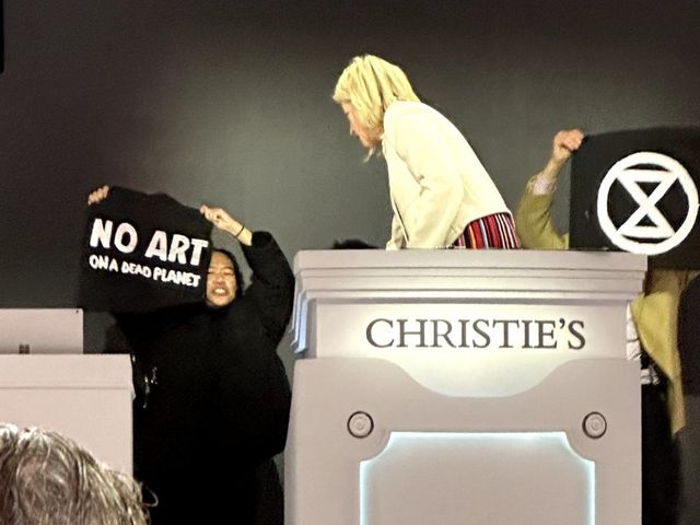Two activists affiliiated with the group Extinction Rebellion took to the rostrum during a sale of works on paper