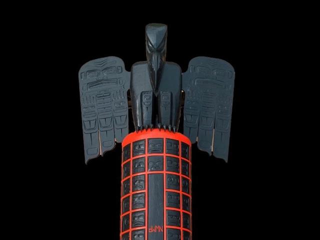 Stanley C. Hunt’s memorial monument features carvings of 130 faces, representing Indigenous children whose remains were found in unmarked graves near a school site
