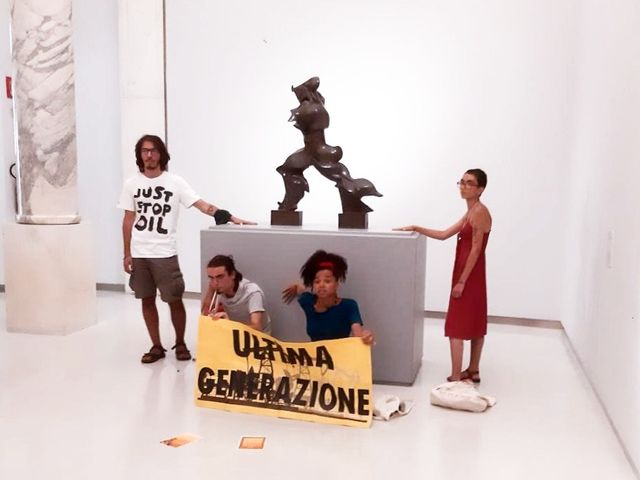 First Botticelli, now Boccioni: eco activists glue themselves to Futurist sculpture in Milan
