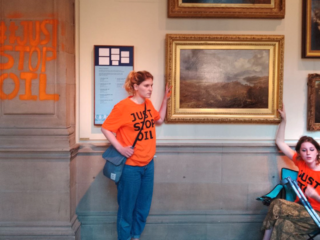Activists glue themselves to painting in Glasgow museum to protest art world's fossil fuel use