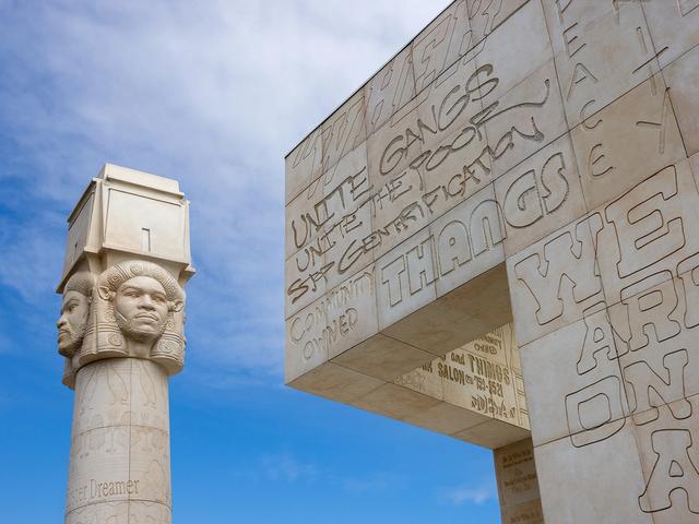 For the New York installation, the Californian artist has carved onto a concrete pavilion references to Afrofuturism and funk music and images of her family and friends