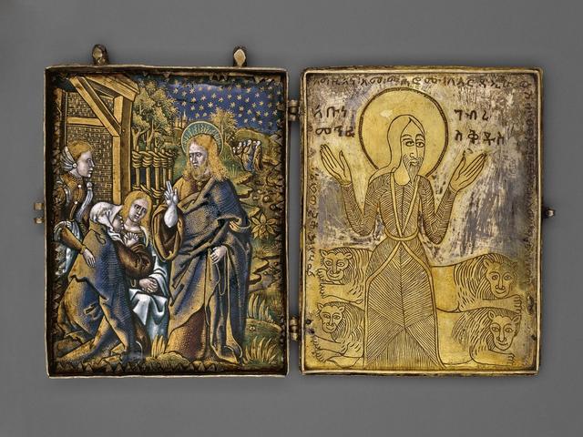 The piece, one side of which is an enamel copy of a 16th-century woodcut, the other side crafted in Ethiopia, reveals how European icons became incorporated into the African country’s traditions