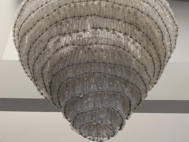 The chandeliers made from repurposed plastic bottles are similar to sculptures Cole has been making and showing for a decade