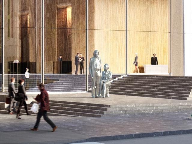 Ray’s large-scale statue of Adam and Eve will beckon visitors into the a plaza while Wool’s enormous mural looms from a glass-enclosed lobby