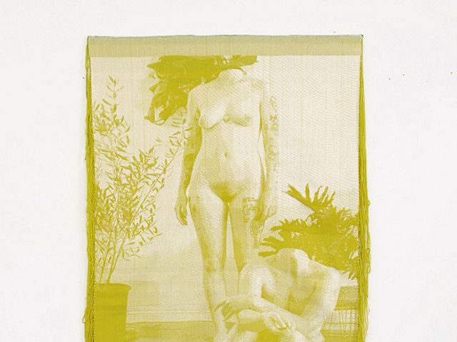 The exhibition, staged in the historic South Street Seaport district, brings textile works to an 18th-century warehouse