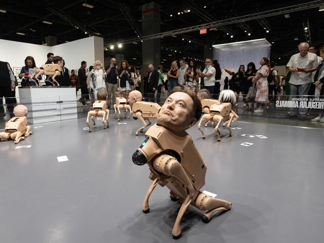 The installation in the fair's new Zero 10 digital art section features robotic creatures with hyper-realistic heads resembling tech moguls
