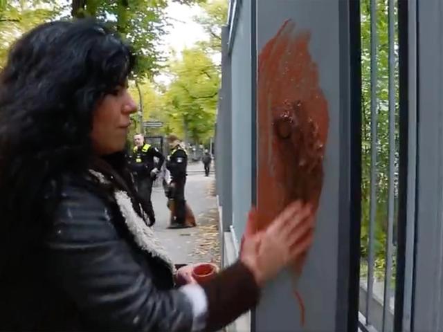 Artist smears blood and hair on Iranian embassy in protest at Mahsa Amini’s death