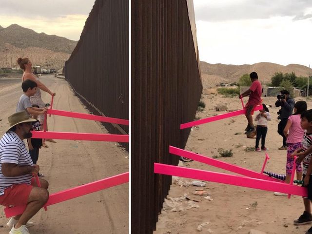 Anti-Trump seesaw by architect duo unites children on US-Mexico border