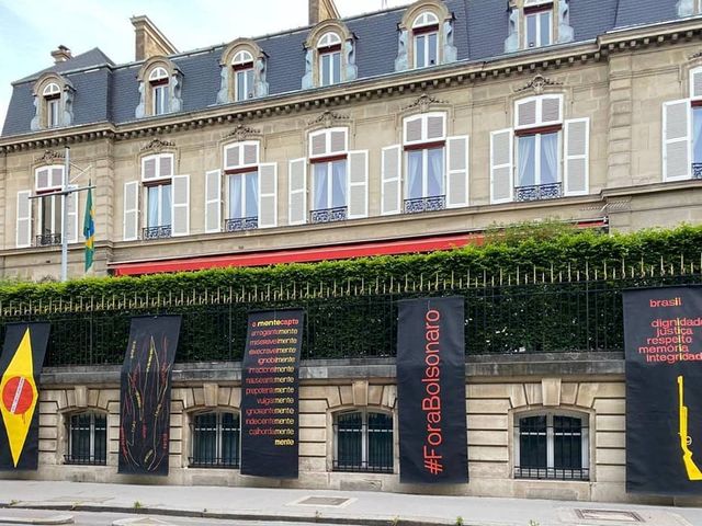 'Impeach Bolsonaro': artist hangs black cloths on Brazilian Embassy in Paris to protest against president