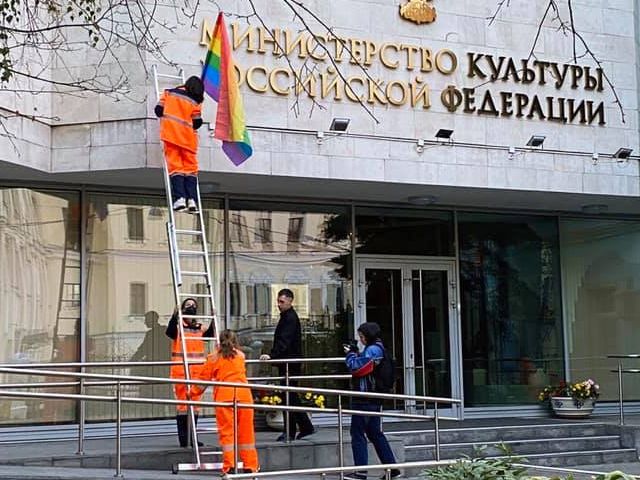 For Putin’s birthday, Pussy Riot hangs rainbow flags on Moscow’s government buildings