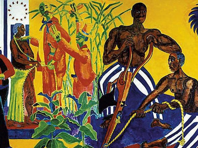 A 1993 painting of the state’s historic role on the Underground Railroad depicts Black slaves as caricatures, while white abolitionists are idealised