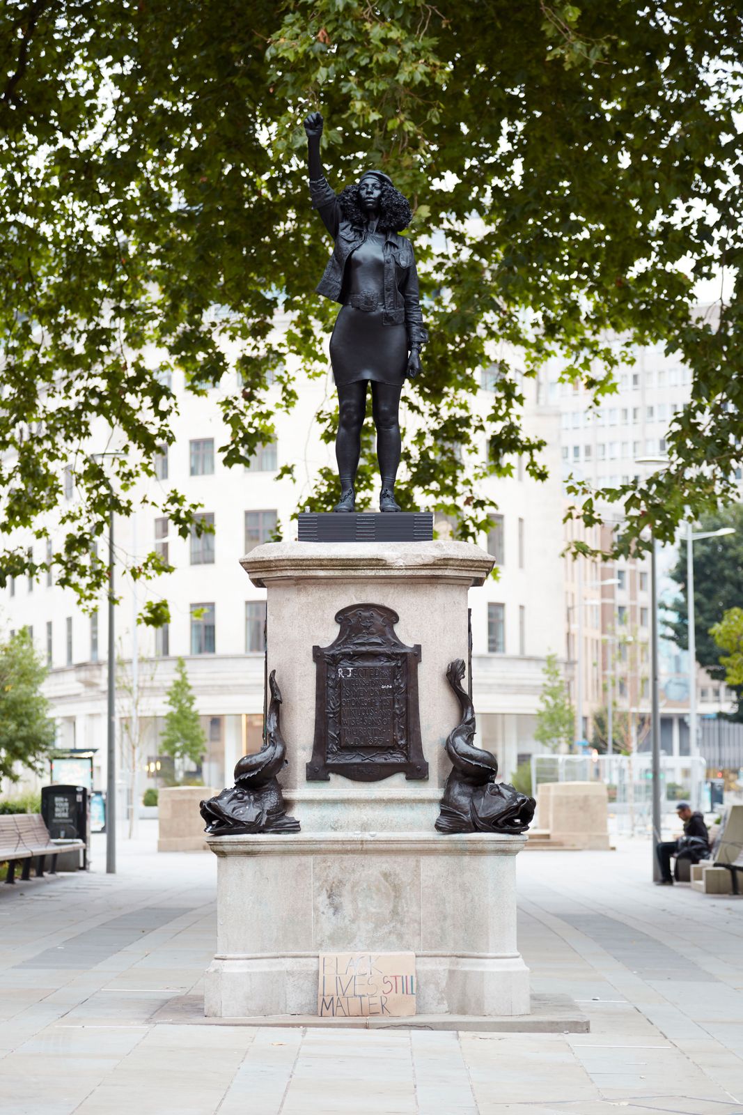 Installed overnight, the work depicts local resident Jen Reid who was photographed on the site when the monument was toppled last month