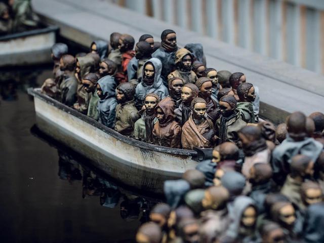 The work, depicting a boat of refugees, is at Context Art Miami fair
