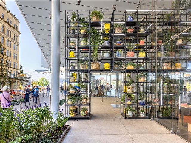 The museum's revamped dining areas include lush installations by Johnson and White Hawk that blend interior and exterior spaces
