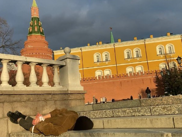 The unidentified artist is pictured in front of Moscow monuments laying face down, hands tied behind his back in a pose that has become synonymous with the atrocities