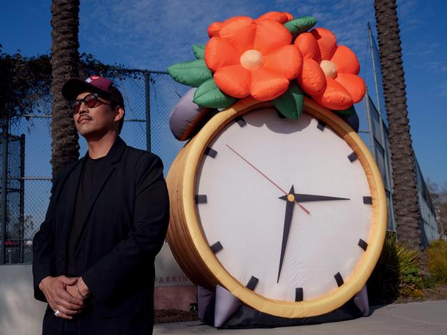 Inflatable flower-topped clock welcomes fairgoers to Frieze Los Angeles