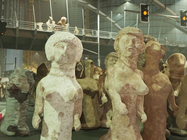 Ruth Patir’s videos starring animated ancient sculptures include a protest scene filmed steps from the Tel Aviv Museum of Art, where her show opens 11 March
