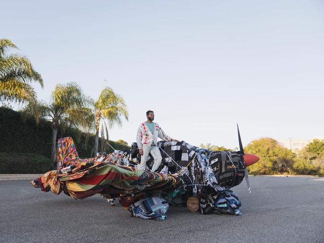 Artist installs quilt-covered airplane at Frieze Los Angeles's Santa Monica Airport venue