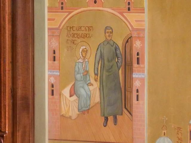 The work in the Holy Trinity Cathedral in Tbilisi depicts St Matrona of Moscow, a visionary and healer, blessing the Soviet dictator