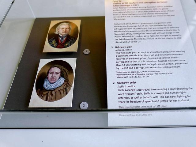 Hand-painted portraits of the WikiLeaks founder and his wife Stella were smuggled into a display case at the London museum in April